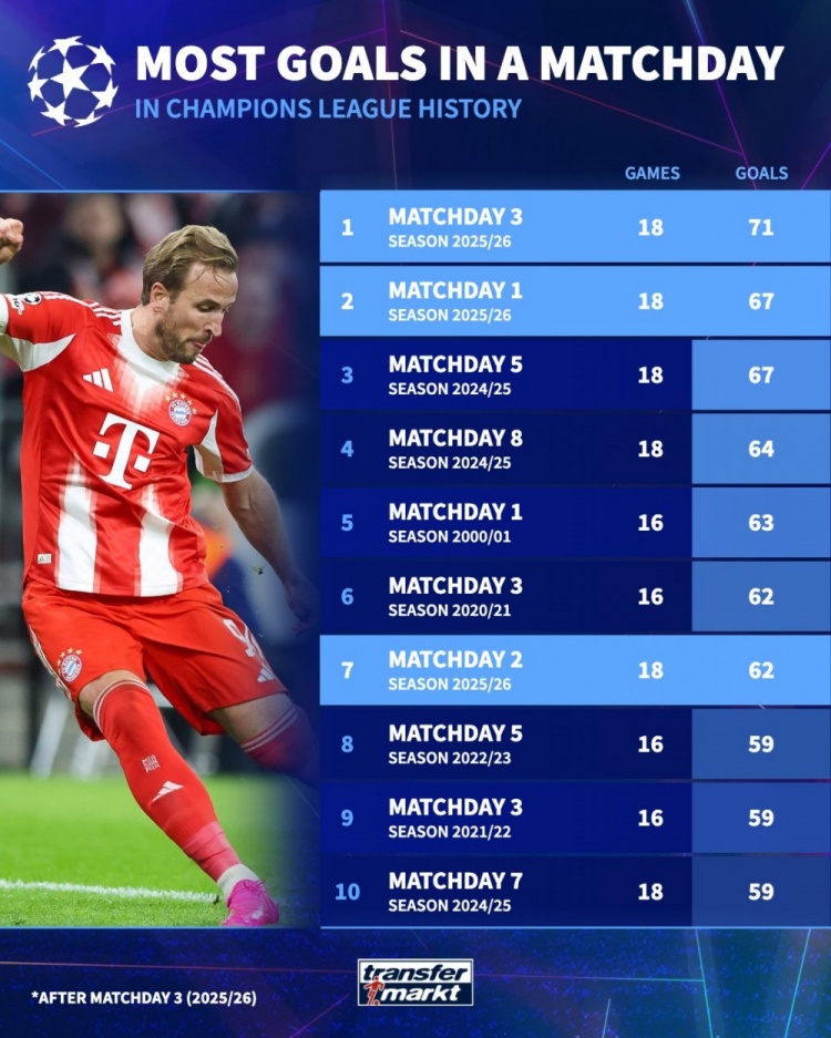Số bàn thắng ghi được trong 1 vòng đấu Champions League: 71 bàn sau 18 trận vòng này xếp thứ nhất, tiếp theo là 67 bàn ở vòng 1 mùa này