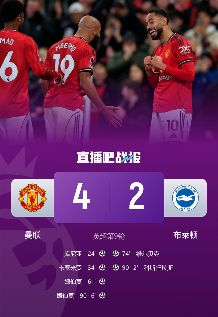 Manchester United đã thắng ba trận liên tiếp với tỷ số 4-2 trước Brighton. Mbemo thực hiện đường chuyền kép của Casemiro và Cunha ghi bàn