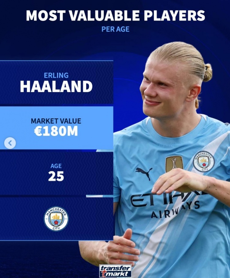 25 tuổi: Haaland (Manchester City), 180 triệu