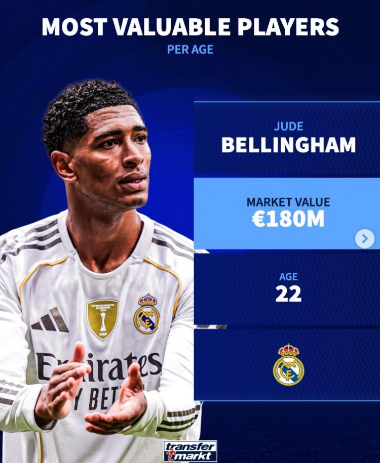 22 tuổi: Bellingham (Real Madrid), 180 triệu