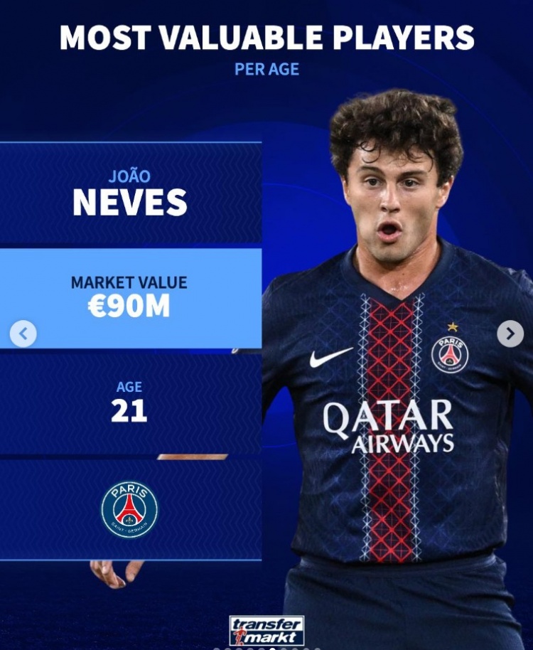 21 tuổi: Joao Neves (Paris), 90 triệu