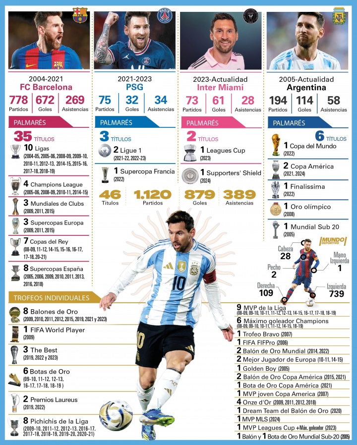 Messi đã chơi trong tổng số 1.120 trận trong sự nghiệp của mình, với 879 bàn thắng và 389 pha kiến tạo, và đã giành được 46 chức vô địch.