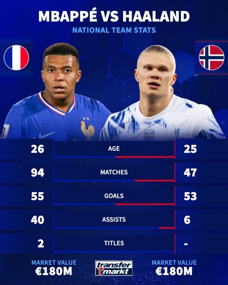 Dữ liệu so sánh chuyển nhượng của đội tuyển quốc gia Đức: Mbappé có 55 bàn và 40 kiến tạo sau 94 trận, Haaland có 53 bàn và 6 kiến tạo sau 47 trận