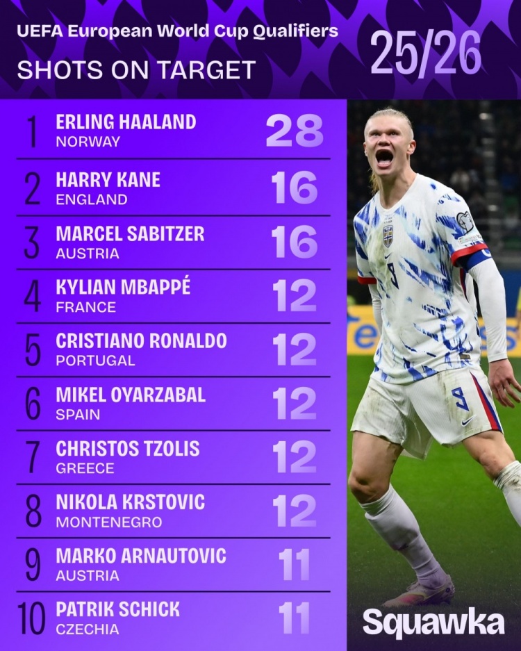 Vòng bảng vòng loại Châu Âu Thế giới này đã kết thúc. Squakwa cũng tính số cú sút trúng đích ở giải đấu này và Haaland dẫn đầu.