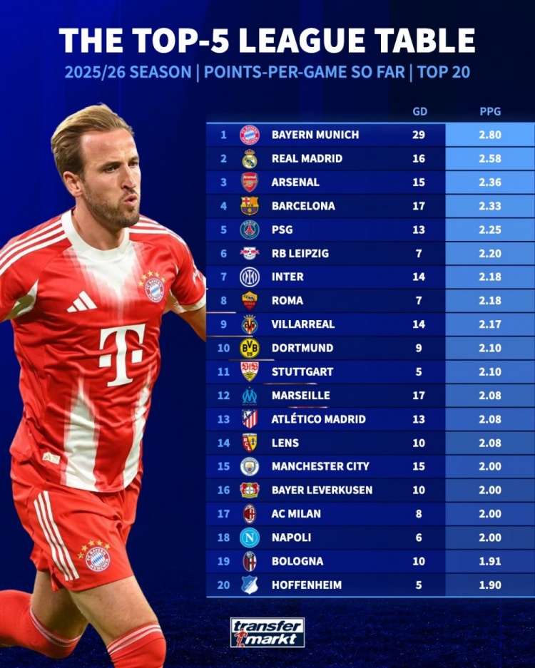 Cuộc chiến ở 5 giải đấu lớn sắp tiếp tục. "Thị trường chuyển nhượng" cũng tính điểm trung bình mỗi trận của 5 đội bóng lớn ở giải VĐQG mùa này và chỉ có Bayern dẫn đầu.