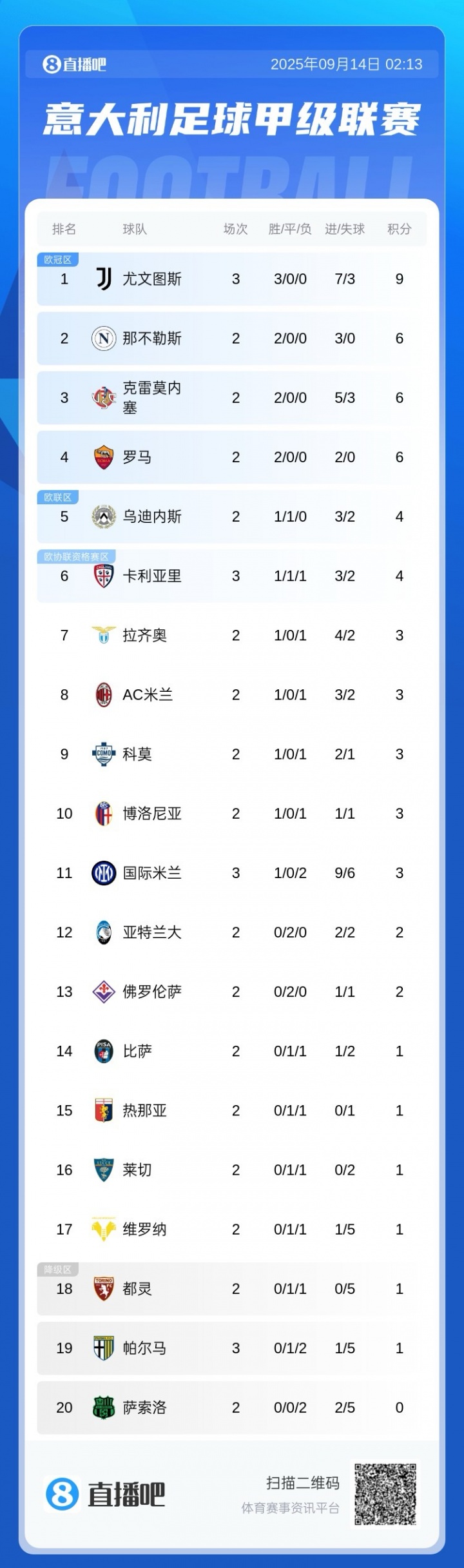 SERIE A SANDING: Juventus đã thắng ba trận liên tiếp và tạm thời dẫn đầu 9 điểm! Inter Milan phải chịu hai trận thua liên tiếp và rơi khỏi top 10